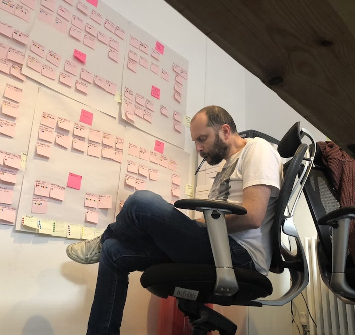 "You know that bit in cop dramas when they’ve got a bunch of notes on a cork board all linked with strings and then one key photo ringed round and labeled ‘prime suspect’? Think that but with a product idea instead of a murderer. Usually."