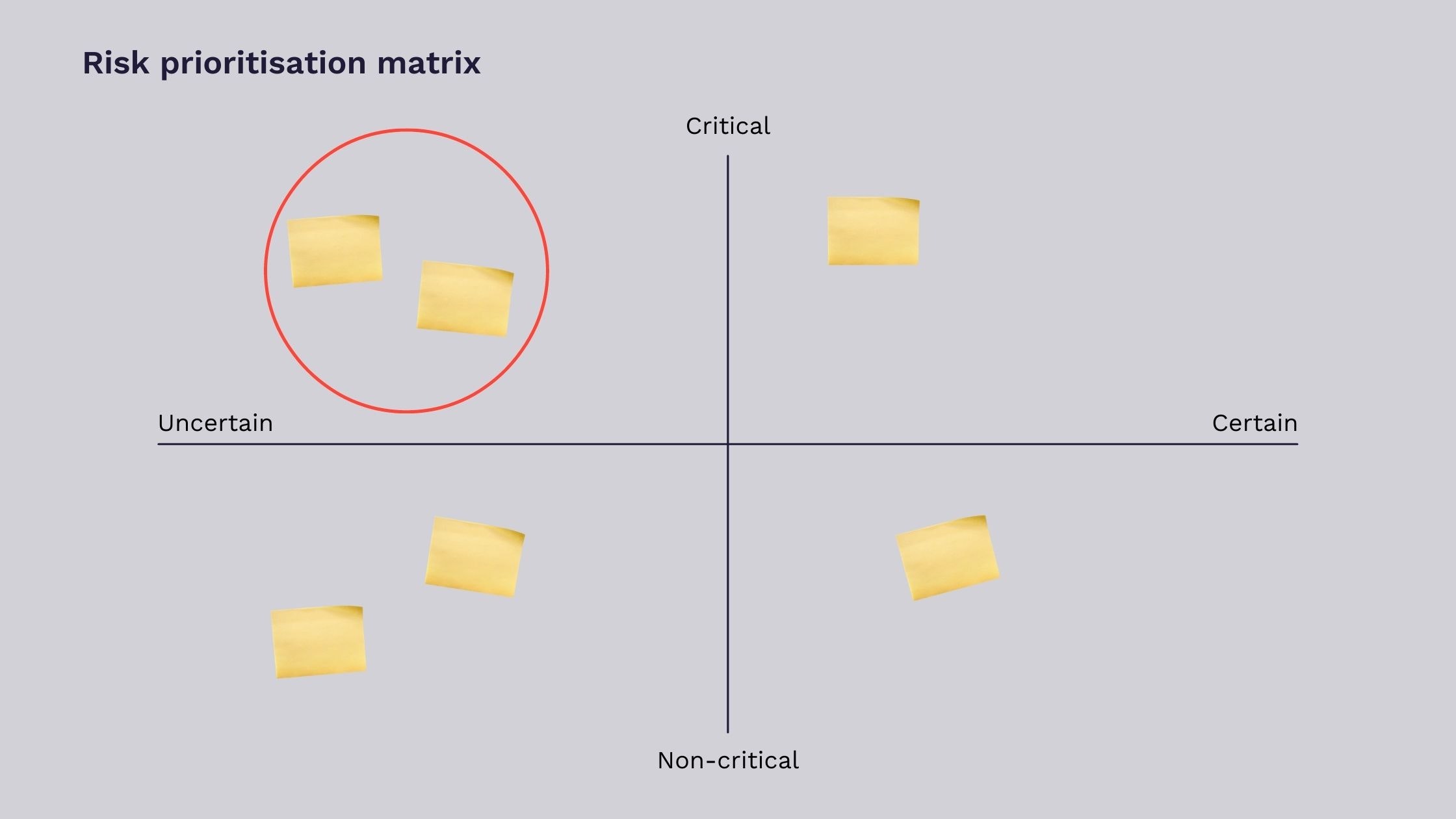 Anything that appears in the critical-uncertain quadrant should be tackled first as these issues have the greatest likelihood of causing the idea to fail.