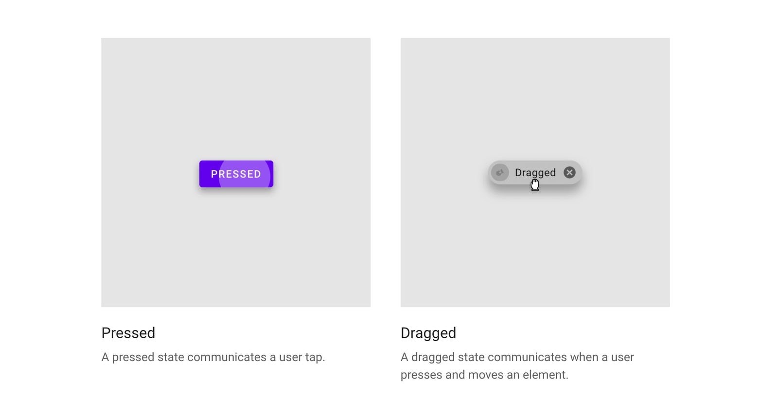 The pressed and dragged states in the material design system are a great example of how the user is able to see that their touch has been recognised. The detection of where the user clicked, shown by the placement of the circle, makes the experience feel trustworthy and elegant.