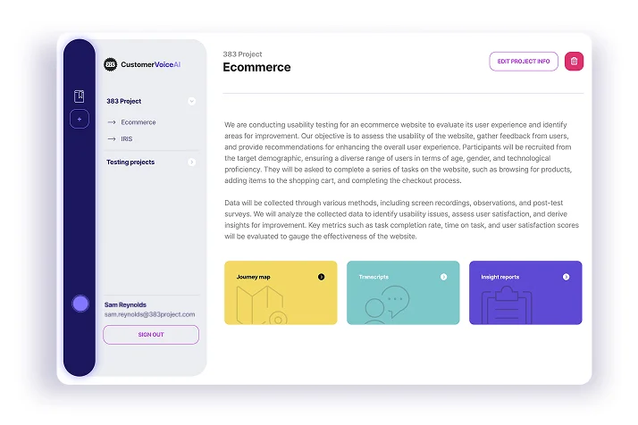 It can distinguish between explicit complaints and subtle frustration, and between genuine satisfaction and polite approval. Insights are automatically categorised into Pain Points, Gain Points and Jobs-to-be-Done, aligned to journey stages and project context.